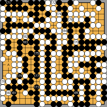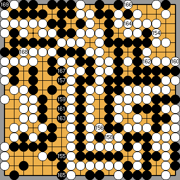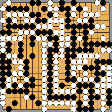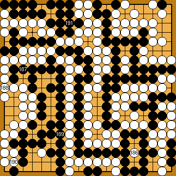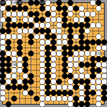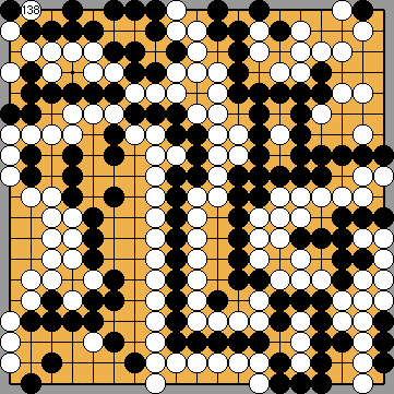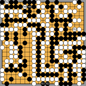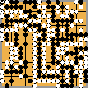 Eventually, he will capture White's bottom group, while White will take Black's large group at the right off the board. White wins the game by ten points. | |