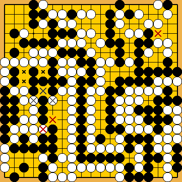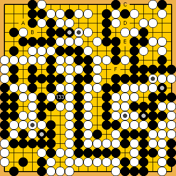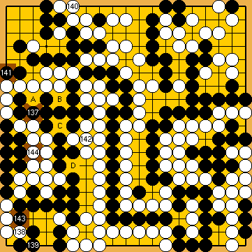 If he fully utilised his surplus Main Semeai Liberties for 4/4 reductions, the final scores of the Main Variations would become White + 1 / White + 3. Black will have to connect at After White's decision point, Black will have to capture at | |