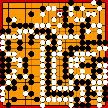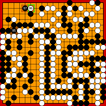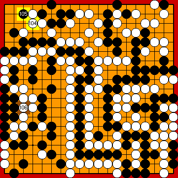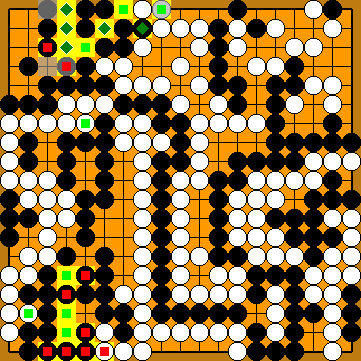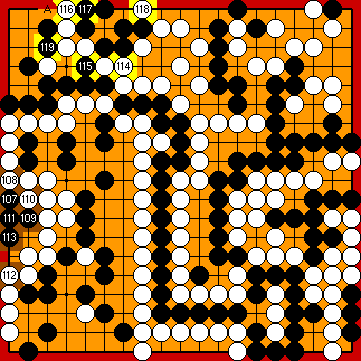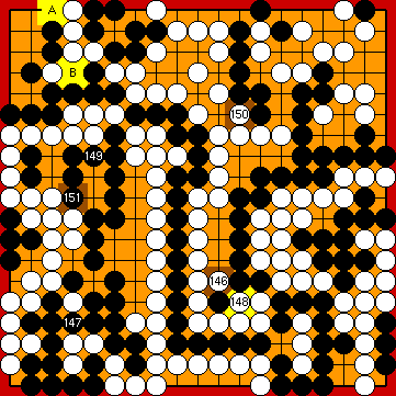 Before the end of the game, Black will have to take White's stones in the upper left corner off the board, with | |