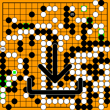 Over a long period of 28b's self-play training, Black's Initial Self-Play Success Ratio (the blue line in the diagram) stabilised in the "green" range between 45% and 55%, and reached this balnced state again at the end of the Jûrokubango (bold section.) We are looking at a viable solution here ! |