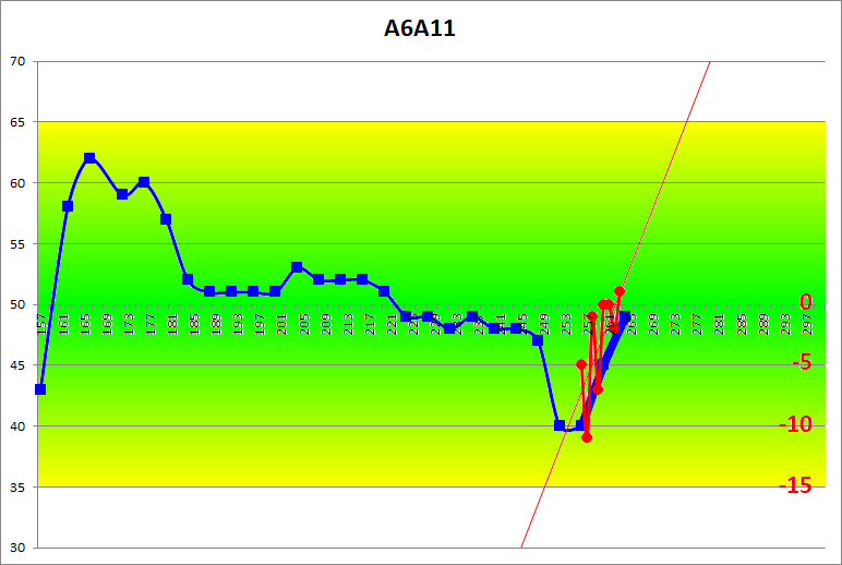 28b's surplus of won games in the Jûrokubango (the red line in the diagram) has reached the range of 0 to -5 (showing a strong upward trend). 28b has therefore mastered this variation just as well as 40b. |